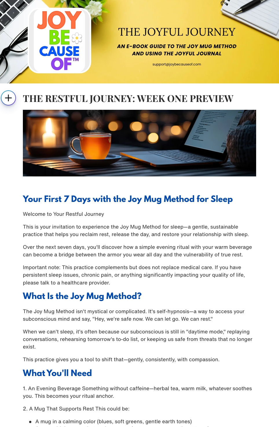 Transform your sleep habits with Week 1 of our Sleep Easy E-Book absolutely FREE! This introductory week gives you a taste of our complete Joy Mug Method program designed to help you develop better sleep routines and wake up refreshed.